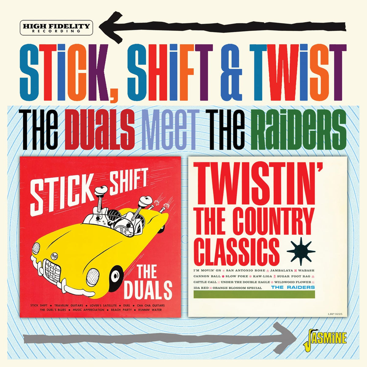 - Lyhyt kuvaus Presenting two hugely collectable Instrumental albums from the early 60s, plus bonus tracks. Quintessential one-hit wonders THE DUALS were a shortlived teenaged guitar duo, who teamed up just long enough to cut the classic West Coast Hot Rod/Drag anthem, ‘Stick Shift’. One of the genre’s earliest national hits, it connected with Hot Rod and nascent Surf music fans, selling some 500,000 copies. However, the duo drifted apart after cutting an LP and one further 45rpm. THE RAIDERS were an equally shortlived, studio-only band, built around guitarist Tommy Allsup, whose recorded legacy likewise runs to an LP and a non-album single. Their revival of ‘Dardanella’ was a huge hit in Scandinavia, in 1962, while their LP “Twistin’ The Country Classics” is something of a ‘must-have’ collectors’ item, appealing equally to Instro and Surf fans.